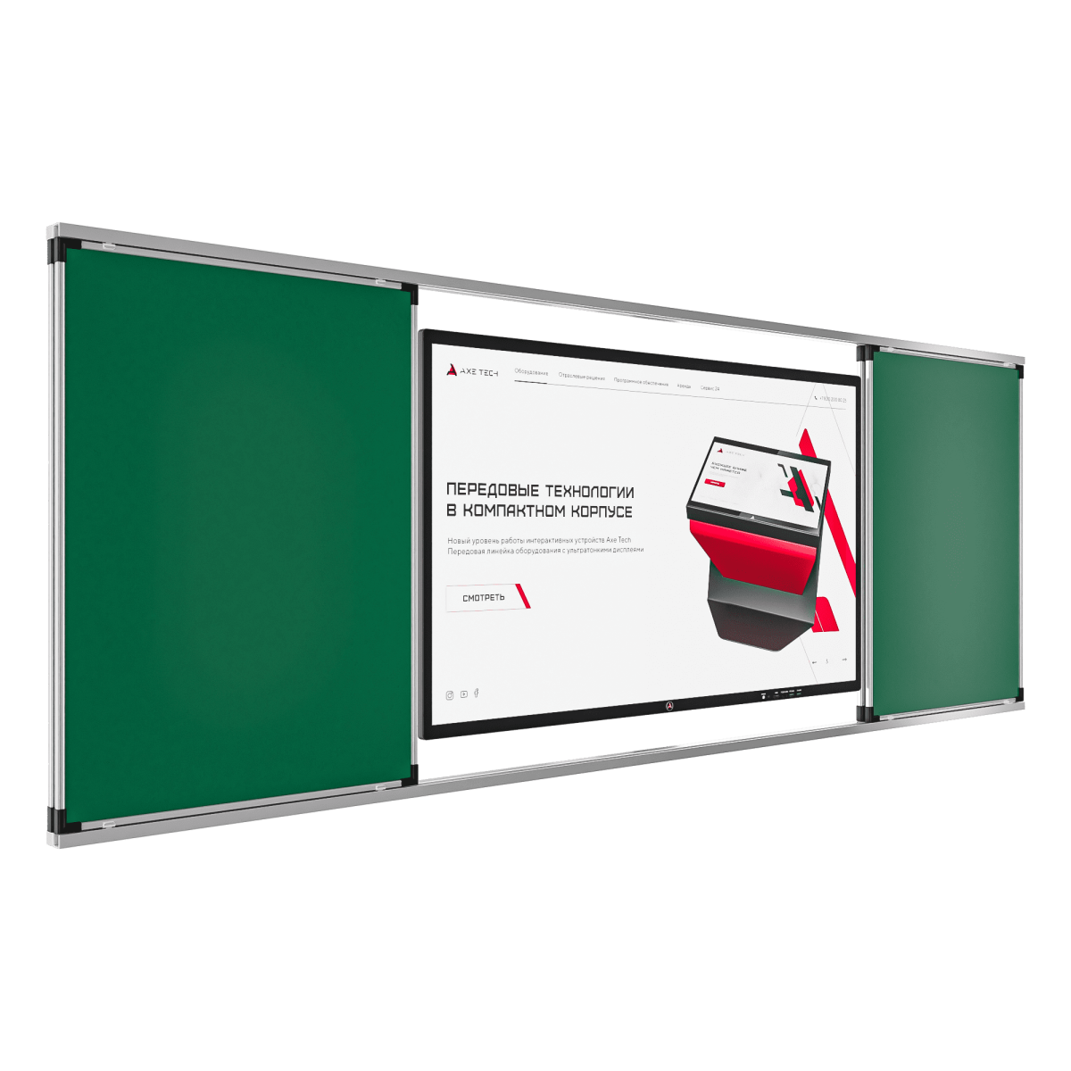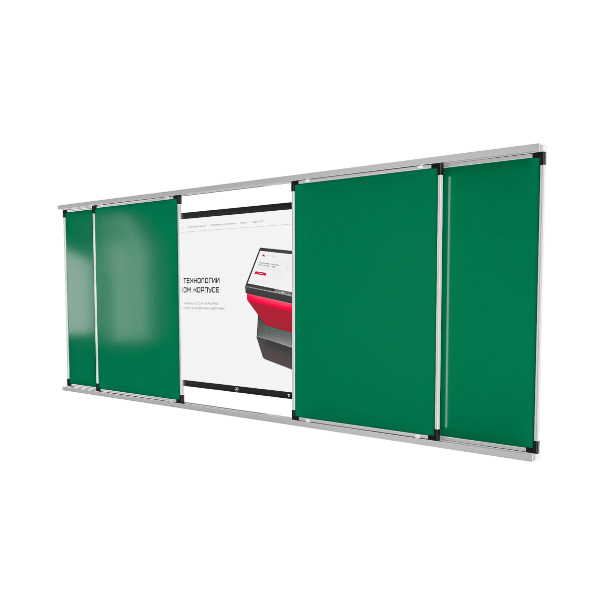 Не знаете как эффективно использовать образовательное пространство и, при этом проводить уроки с использованием последних инновационных технологий? Интерактивный комплекс с рельсовой системой станет прекрасным решением. Данная модель позволяет совместить работу со школьной доской и интерактивной. Обучающийся или преподаватель может не только делать записи на доске мелом или маркером, но и сопровождать свое объяснение включенной презентацией на интерактивной доске. При необходимости, благодаря рельсовой системе, классическая доска может закрыть интерактивный дисплей.