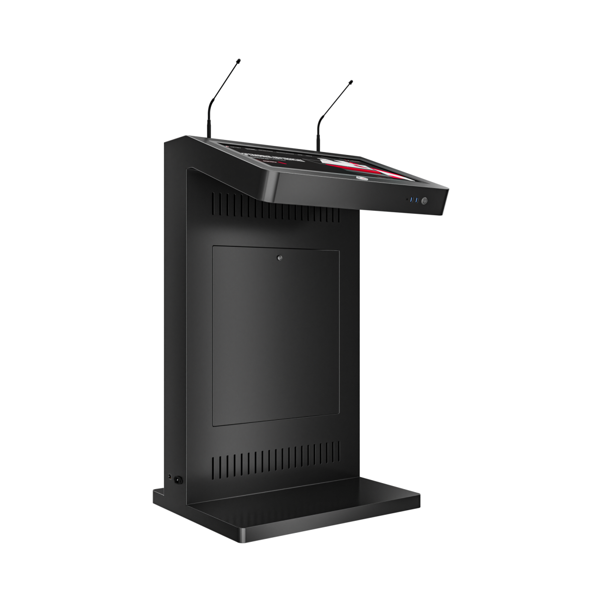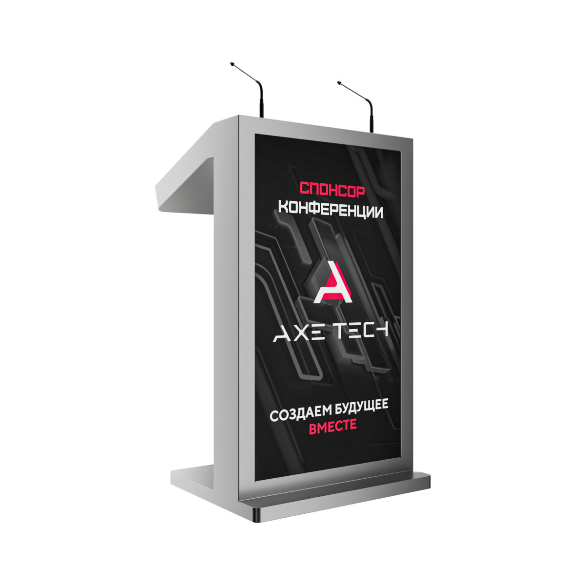 Мультимедийное решение, которое позволяет не только ярко выступить на большую аудиторию, с отображением презентационного материала, но и эффектно продемонстрировать рекламную информацию о компании, предлагаемых товарах / услугах, спикере, на большом внешнем дисплее трибуны. Модель Double оснащена мощным микрофоном, сенсорным дисплеем для спикера, а также большим внешним дисплеем для рекламного контента и набором разъемов для подключения дополнительной техники. Такая трибуна станет прекрасным помощником на конференциях, выставках, спортивных мероприятиях или других мероприятиях, где требуется визуальная поддержка презентаций и общение с аудиторией.
